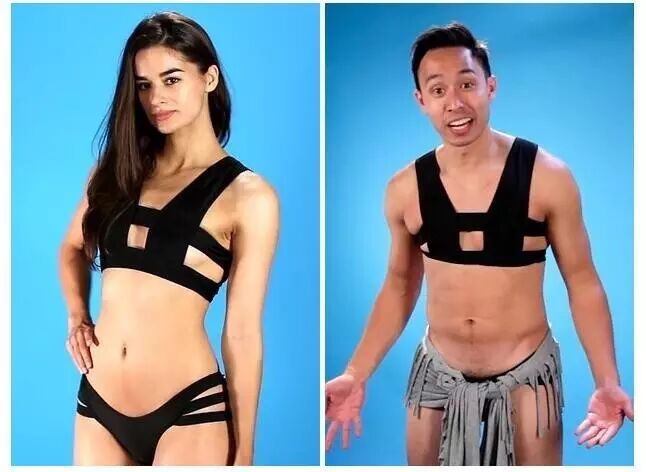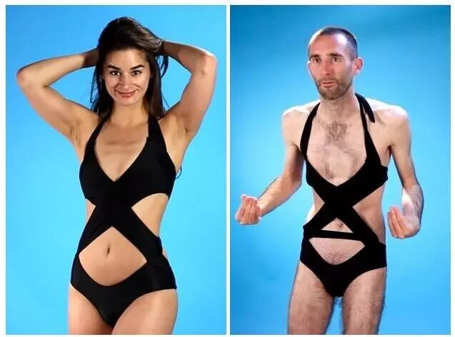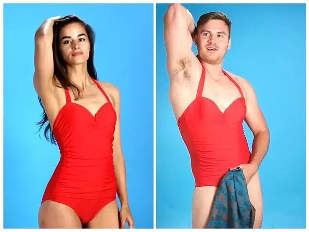 最后扔个彩蛋。有个外国媒体邀请了一些男生尝试了一下女生的泳装,是这个样子的,你感受一下……