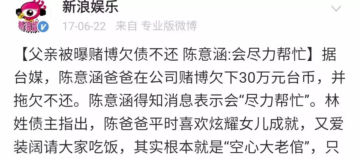 而且除了感情生活坎坷外,陈意涵的家庭生活里也有很多”难念的经”,据说前段时间正经历着失恋的陈意涵还在烦恼着父亲的赌债。