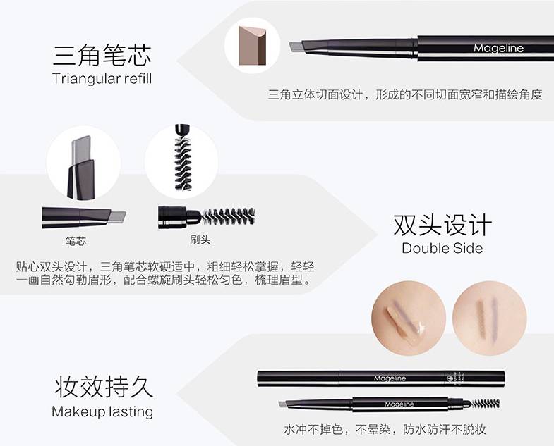 1.以眉型的底线为准,将眉头部分用麦吉丽塑形双头眉笔向上画,并且往后一笔笔画出轻柔的线条。