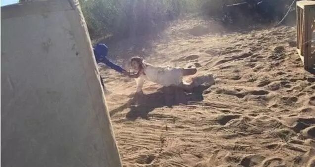 据说这是室外40多度的高温,赵丽颖谁在沙子上,别人都是带着帽子或者裹住脸,赵丽颖直接躺在了沙子上,表情到位的完成每一个动作。