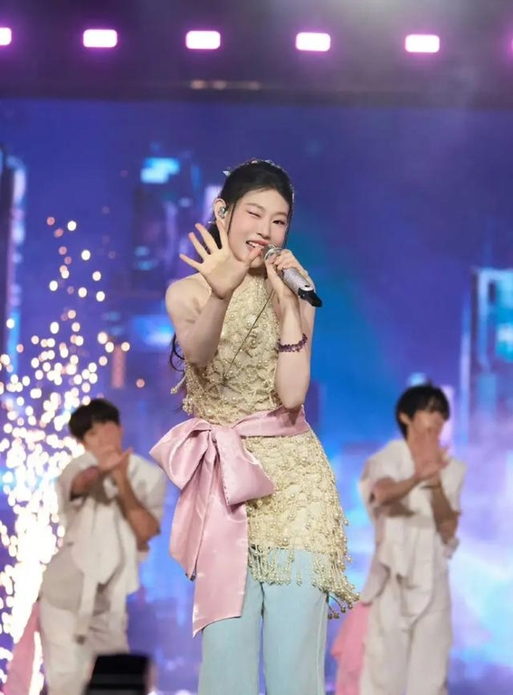 音乐节那天,她穿着蜜桃色连衣裙走上舞台,背后是声浪和聚光灯。