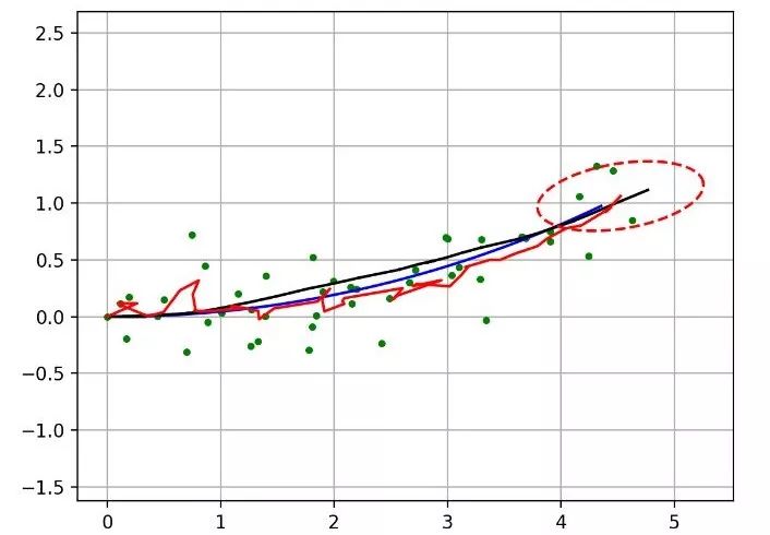 蓝线为真实路径,黑线为导航推测路径(dead reckoning trajectory),绿点为位置观测(如GPS),红线为EKF估算的路径。