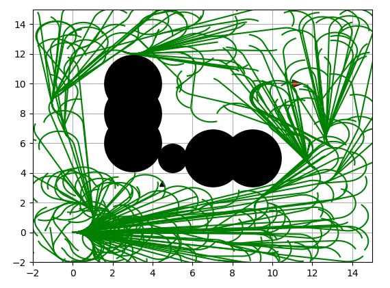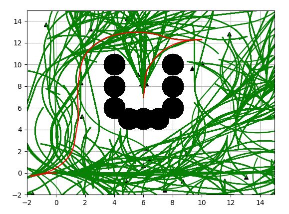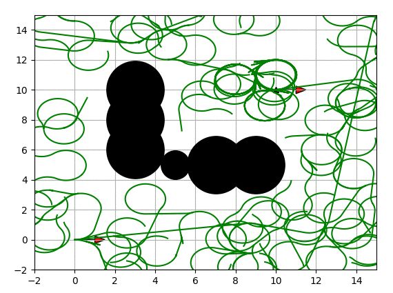 黑色圆为障碍物,绿线为搜索树,红叉为开始位置和目标位置。