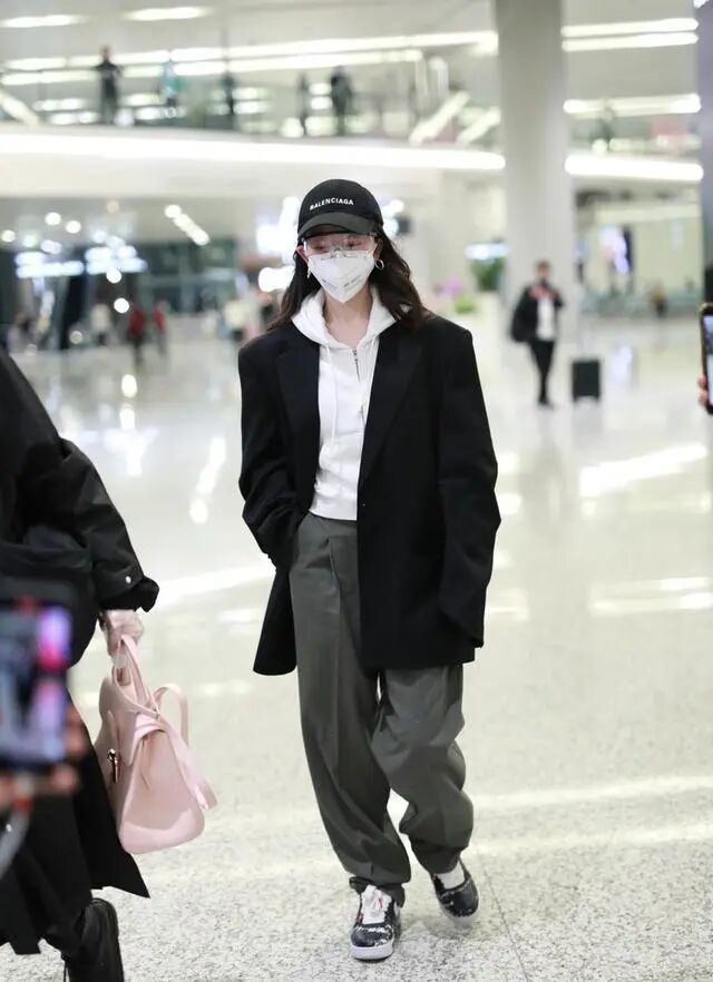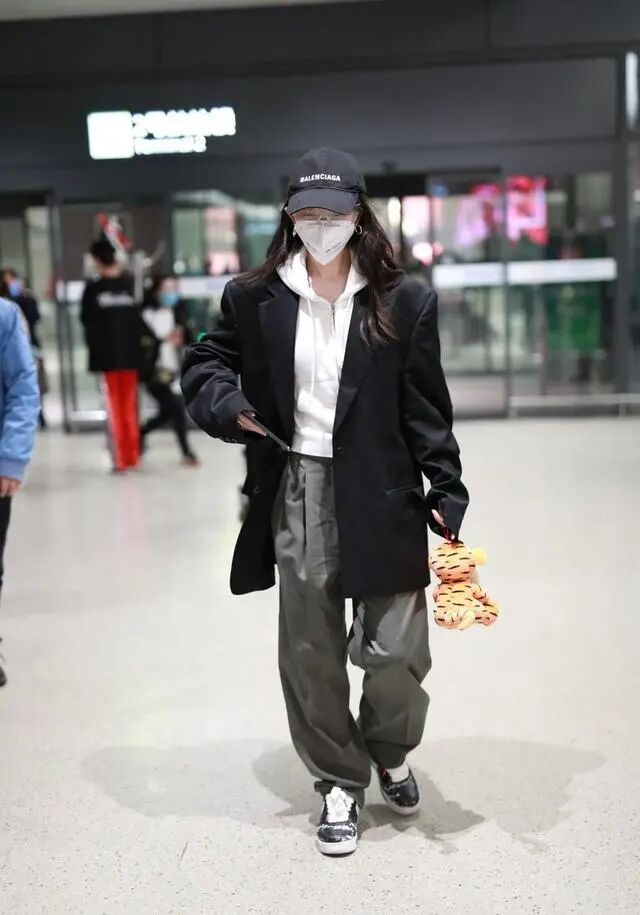 为了不让宽松的上衣和裤子把整体的气质营造的过于颓废,蒋梦婕在宽大的西装外套里面穿了一件白色连帽卫衣,这样的卫衣最容易给整体一种运动活力感,这样的活力范最能提整体的精气神,让整个人都显得精神了不少。大家在搭配过于宽松的外套时也可以借鉴这种穿法哦。