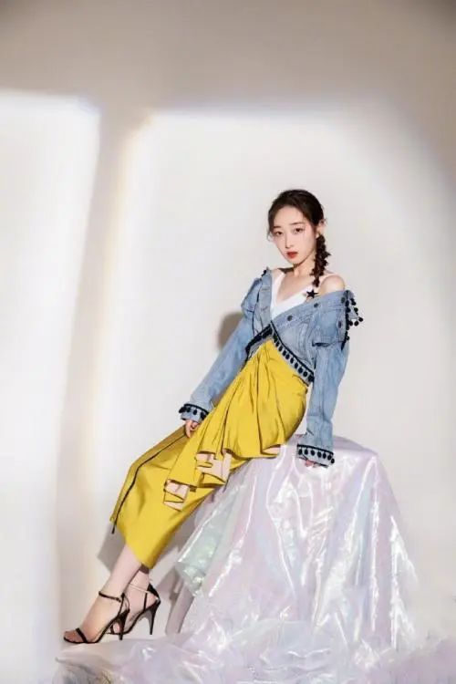 蒋梦婕在拍摄杂志时,可能就不那么注重穿搭的实穿性,表达时尚时,元素的碰撞是必不可少的,牛仔和丝质长裙搭配在一起,配上简单的高跟和白色背心内搭,在风格上气质上相隔很远,却在气质的碰撞下,产生了不一样的前卫感,这样的前卫感让整体看起来更加时尚也更加的有格调。