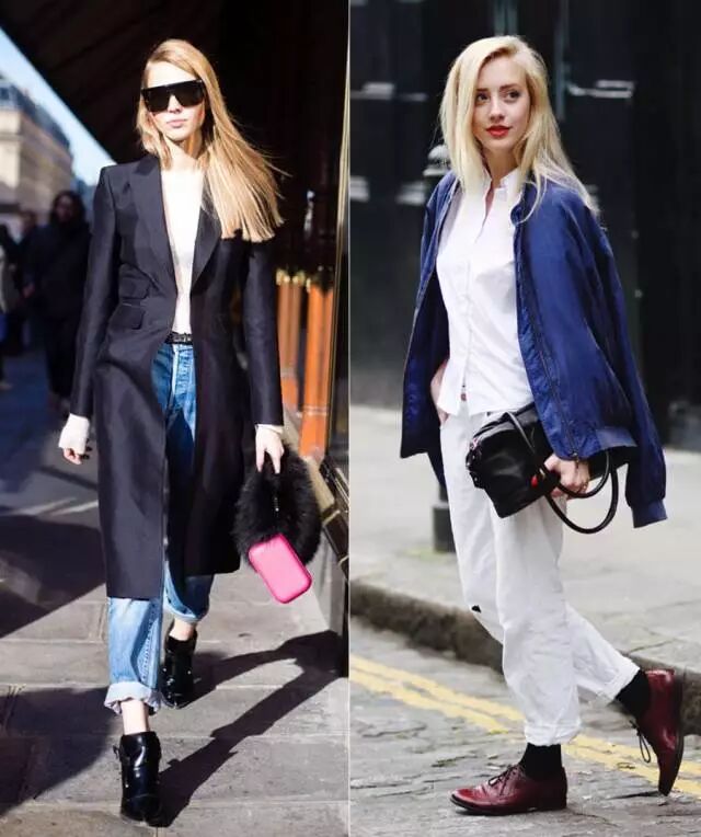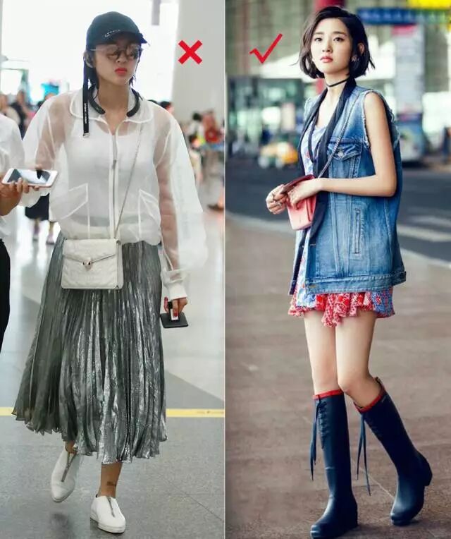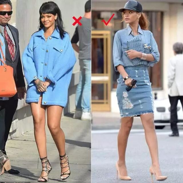 ▲左边这件Oversize外套让他看上去很魁梧不说,腿也看上去很粗!而右边的这套虽然也是牛仔,但收紧的线条感就显瘦多了,裙子的长度盖住了大粗腿,小腿就胖得没有那么明显啦~
