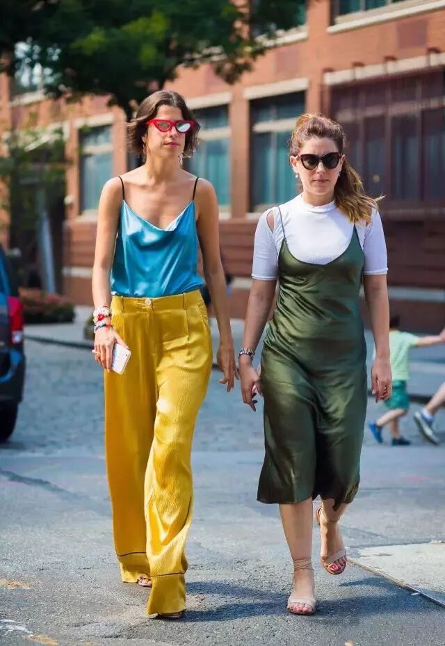 有光泽感的面料很显高级是没错!但请注意的是如果你不是瘦子,它们会显胖!!!下图中,两位都是穿得缎面材质的衣服,微胖的那个有点惨。