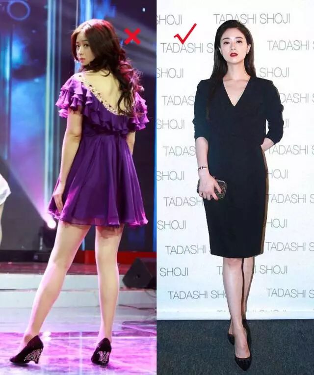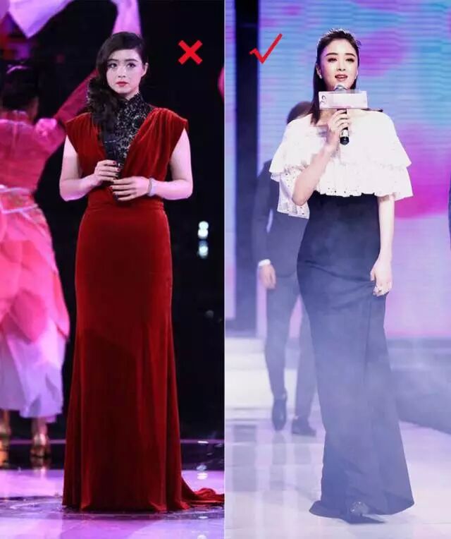 这一点蒋欣也曾吃过亏的,当年丝绒面料流行得不要不要的,她也跟风穿了条高领+丝绒的裙子,结果很惨!跟右边这件黑白相间的裙子对比都感觉不是同一个人。尴尬!