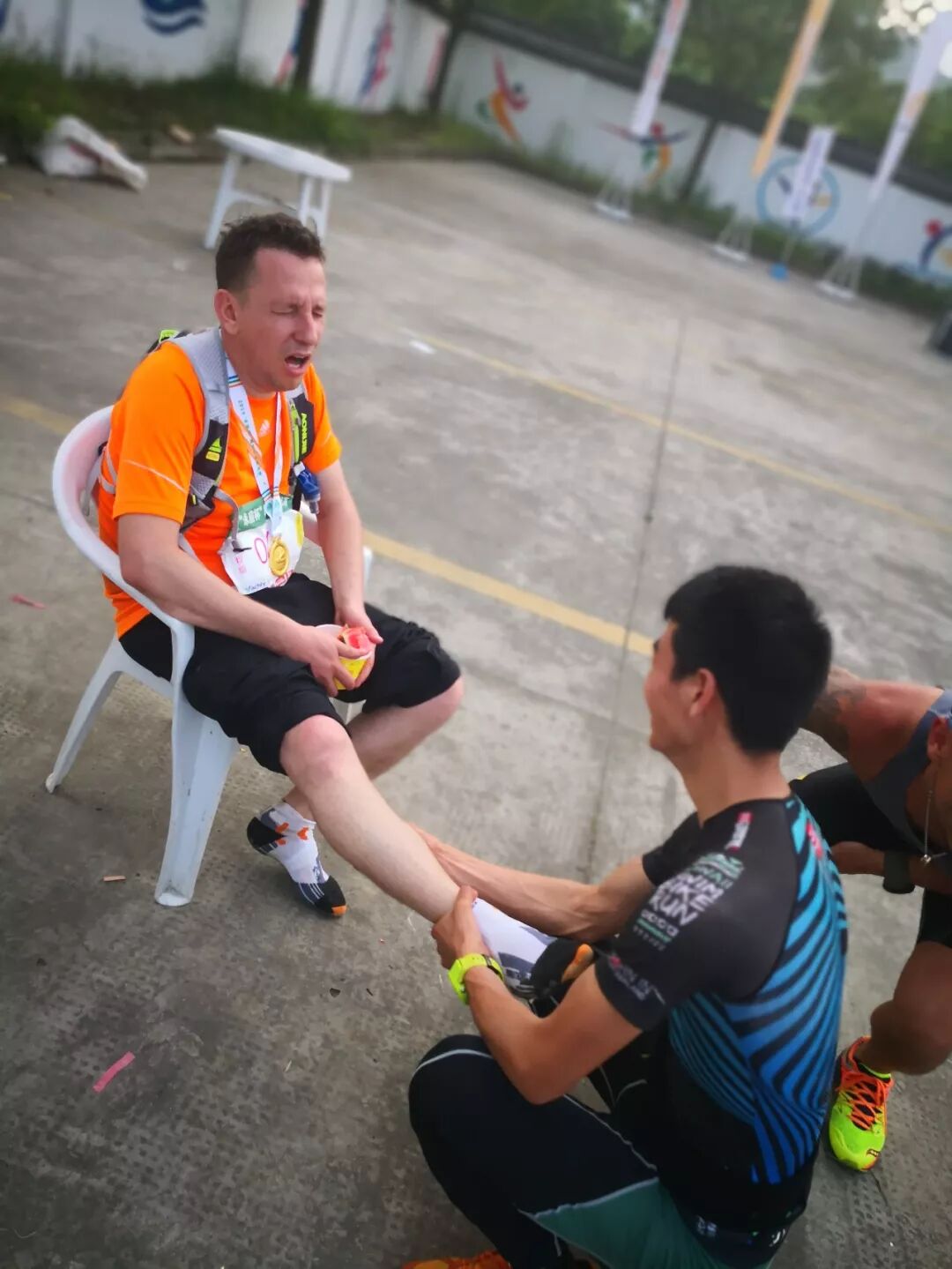 一路往前走,看到一些跑者出现一点点疲劳的状态,就会跟他们在一起开玩笑,鼓励他们。