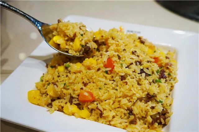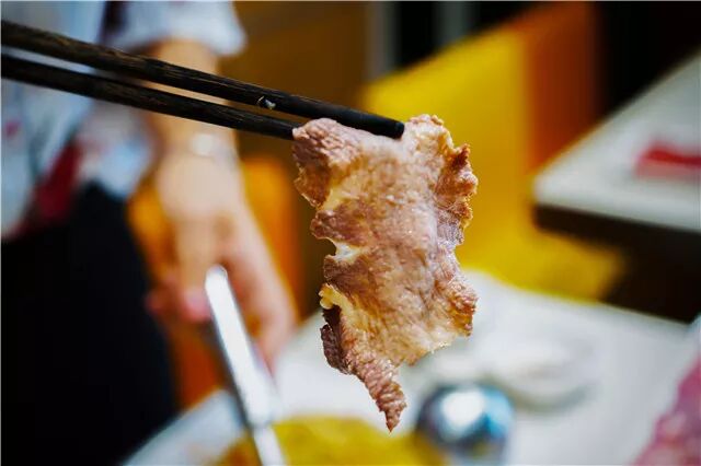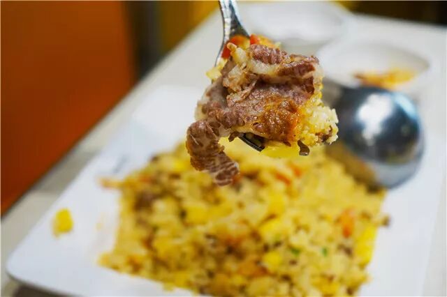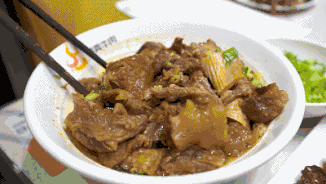 顶真湿炒牛河里的牛肉用辣沙茶和炸蒜蓉腌过