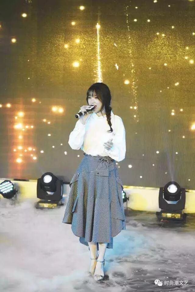 白色简洁的衬衫搭配高腰条纹荷叶边不规则过膝裙,脚踩银色厚底高跟鞋,麻花辫更显甜美。
