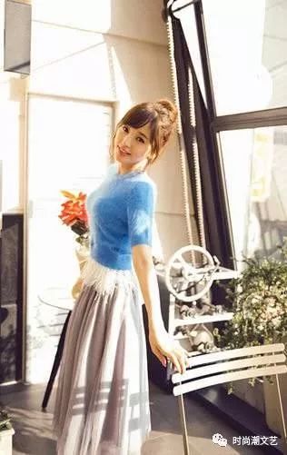 半袖的蓝色流苏上衣搭配裸色的纱网过膝裙,身材凹凸有致,面容清丽温婉甜美;