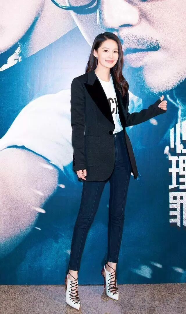 最近,李沁一件黑色修身西装,搭蓝色紧身牛仔裤,美出新高度。最抢镜的是她脚上的白色尖头绑带鞋子