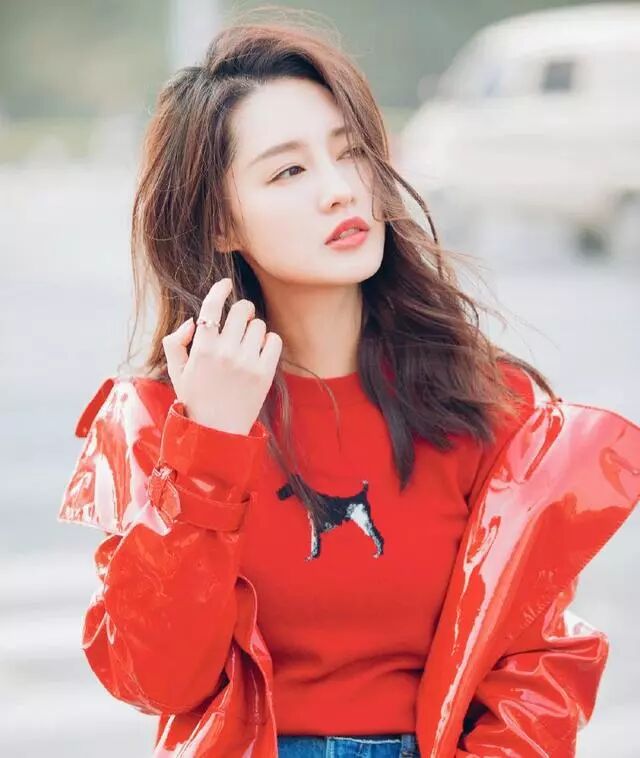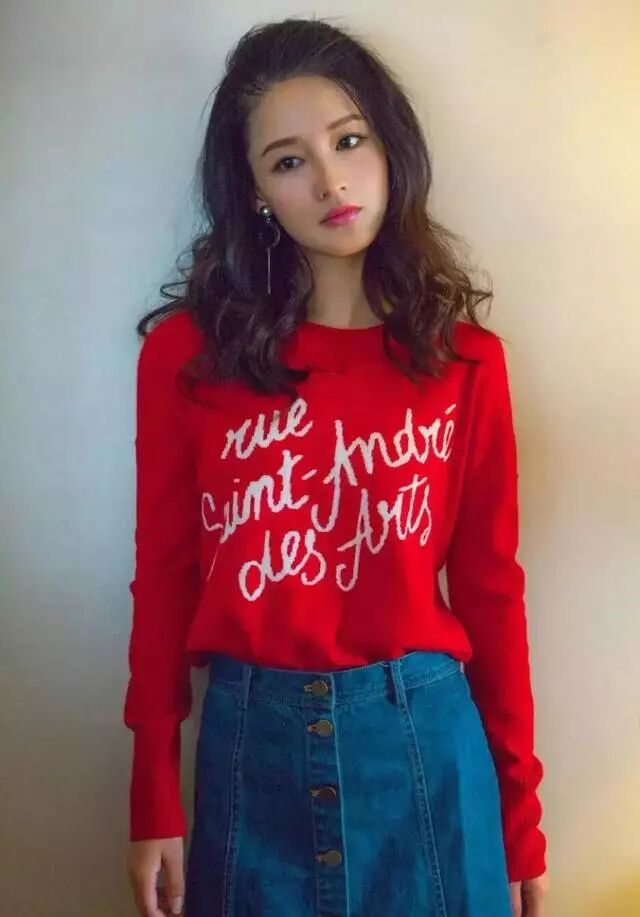 李沁真的很会穿搭,红色针织上衣,衬托出李沁的完美脸型,更加具有女神的韵味,蓝色高腰牛仔裙,让自己身材得到凸显。