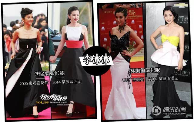 在东家华裔兄弟20周年的庆典上,莲花姐一身拼色绸缎长裙神采飞扬的现身,宽大的裙摆款式令人想起了她在2006年的金鸡百花奖红毯上穿过的一条长裙,一样的裙裾飞扬,不一样的她是褪去青涩之后更自信沉着的美艳;今年为《变形金刚4》做宣传活动时,李冰冰又穿起了抹胸鱼尾裙,她最钟爱的款式之一,自从2007年华表奖起便时常以这种款式的礼服亮相,对比几年前,莲花姐虽然胸前不见长,但是体型不再那么干瘪,肌肤也更为白皙明亮,神态动人,气质见长。