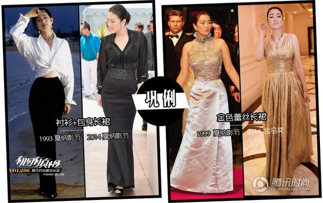 1993年,穿着白衬衫和黑色包身长裙的巩俐在戛纳海边随意摆出一个抬手姿势,定格成了华人女星征战国际舞台的历史上最经典的一刻,即便隔着20年的时光看去,仍是无可挑剔的时髦感。这身经典的装扮被巩俐换换花样又搬上了今年的戛纳红毯,用黑色透视衬衫替代白衬衫,更符合她如今的性感大气;1999年的戛纳红毯上,金色蕾丝长裙也是巩俐经典的LOOK之一,在前不久刚刚举行的金马奖上,她再度选择了一身金色蕾丝长裙,仍是丰腴的美丽,只是用深V和珠宝让这份美丽更加直白而外露,犀利且霸气。