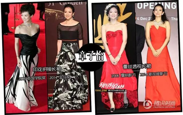 “国际章”征战红毯的历史虽然没有前辈巩俐那么悠久,但是次数上却后来者居上,因此类似款式重复穿也难以避免,只是自己跟自己也可以有个纵向的较量,一次次超越才是正经。刚刚在金马奖上亮相的这身礼服,跟2005年她在英国学院奖上穿过的一条印花拼接长裙就有几分类似,但是比起当年的蓬蓬头和裸露得有些过分的限度,10年后的章子怡胜在含蓄高贵优雅大气;最近在新加坡影节现身的这条红裙,也能在很多年前的衣着中找到类似款式,但当年的服装和配饰品味显然不能同如今相比,相较下而今的表现如同从合格线走向满分,赢自己也要赢得漂亮!