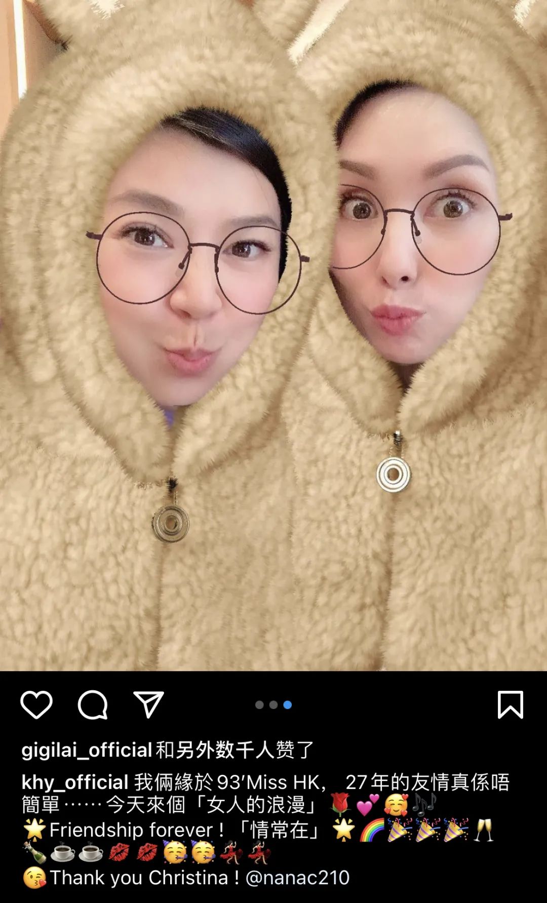 郭可盈虽然没有公开叙旧的对象是谁,但她有写下“我俩缘于93 Miss HK”,故此还是有明眼人认出对方就是刘飞飞。时光荏苒,一转眼27年过去了,郭可盈也不禁感慨27年的友情真是不简单,的确,人生也没有几个27年,重点是彼此还能保持友情不变,真的就是难得中的难得。