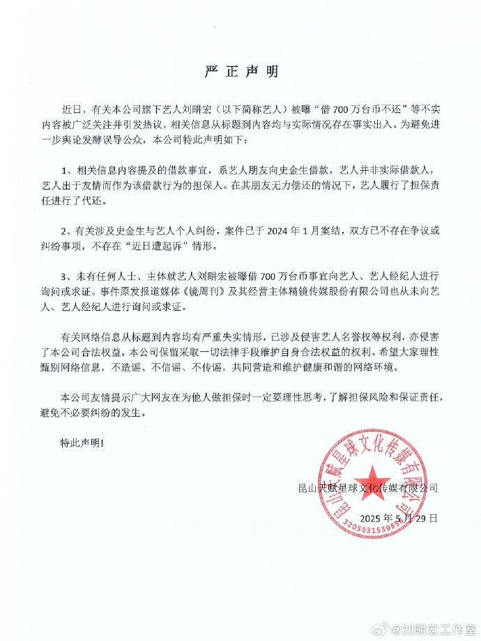 近日,有关本公司旗下艺人刘畊宏被曝“借700万台币不还”等不实内容被广泛关注并引发热议,相关信息从标题到内容均与实际情况存在事实出入。为避免进一步舆论发酵误导公众,本公司特此声明如下: