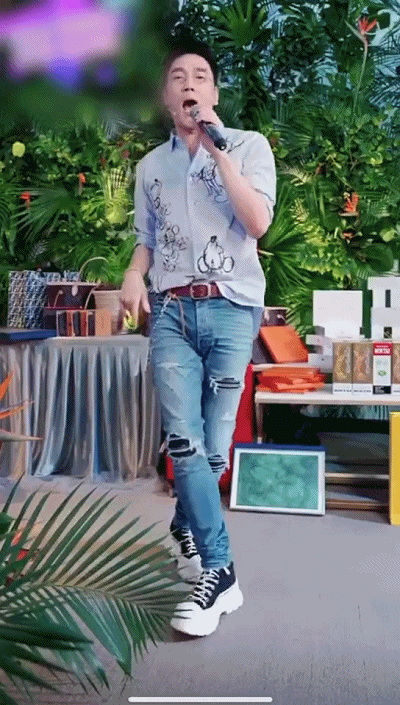 穿的很年轻,简单的花衬衫+紧身裤+厚底帆布鞋,对着镜头自信又大方的唱唱跳跳,看起来活力满满。