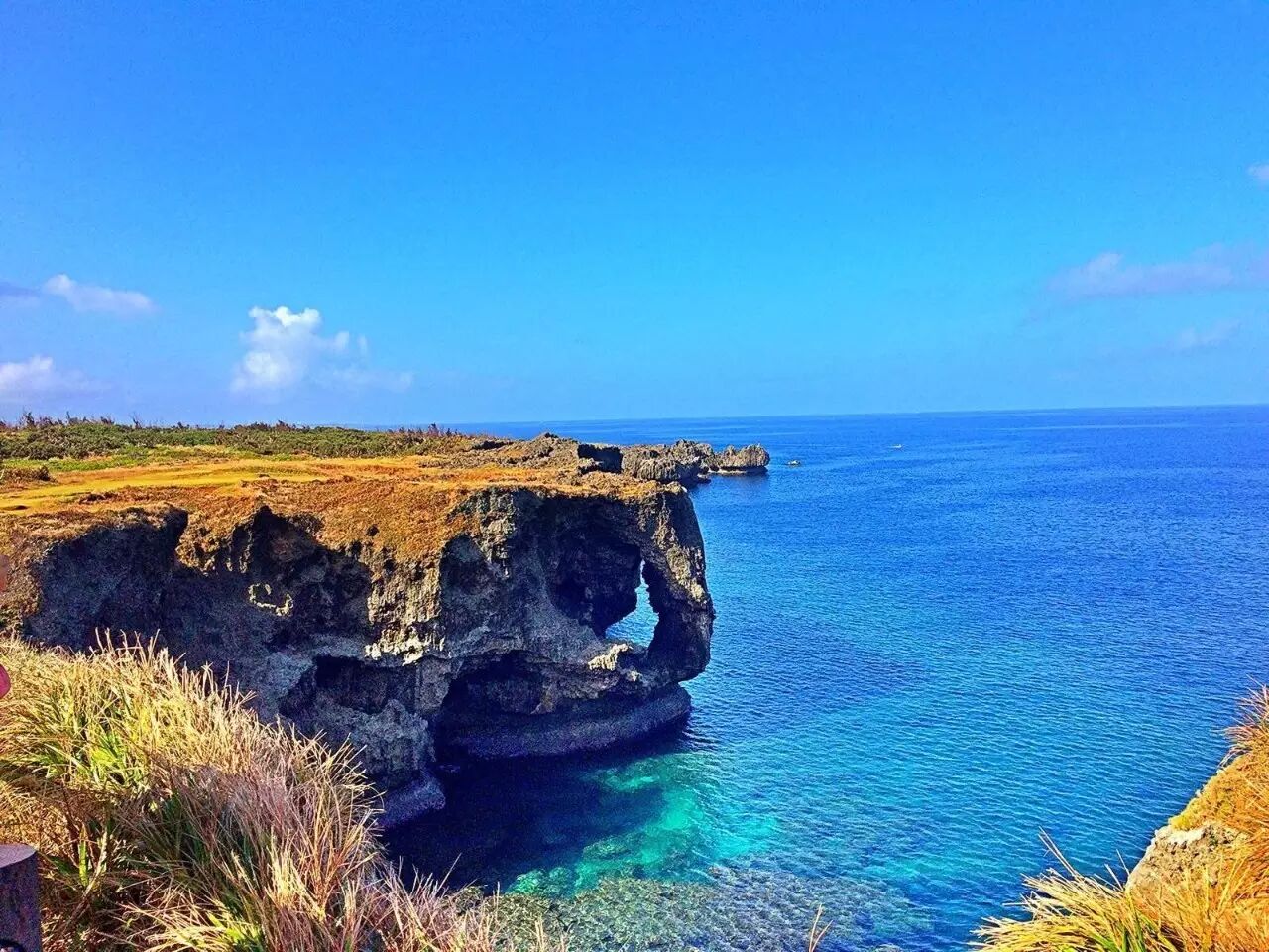 第一站:万座毛(游览时间约为1小时),能容纳万人坐下的草原,“毛”在冲绳便是草原的意思。正如其名,这里的天然草原是一望无际的,周围的植物群落被冲绳县指定为天然纪念物。其次,这里还有犹如大象头的隆起珊瑚礁形成的悬崖绝壁以及拍打岸边岩石的巨浪,大自然的雄伟气势尽收眼底!