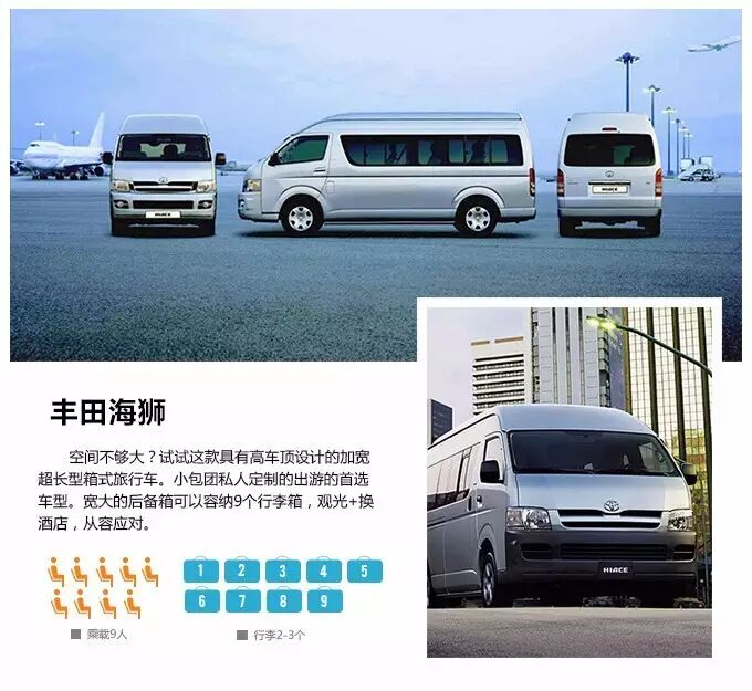 包车一般有5座、7座、10座的分别,如果有6岁以下的宝宝,可以免费提供一个儿童座椅。