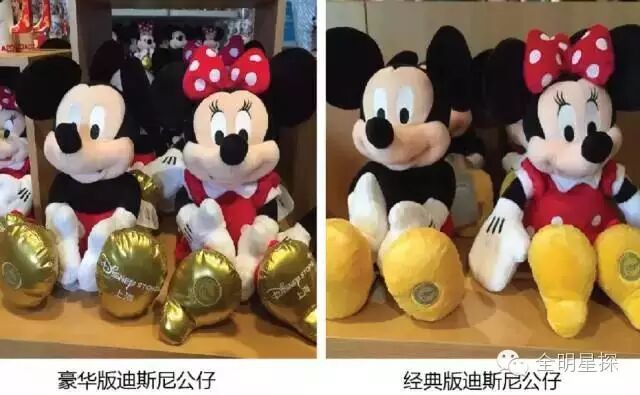 米奇公仔中号:240元/个;小号:136元/个,中号普通非限量版米奇米妮公仔:220元/个。豪华版和普通版的区别:脚底是金色的,印有“Disney Story 上海”。