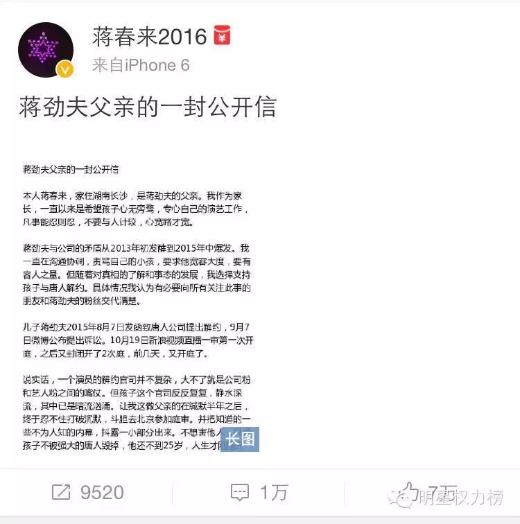 甚至蒋劲夫的父亲也亲自开了微博,写了很长的一篇长微博,来痛斥唐人对于蒋劲夫的种种不公。