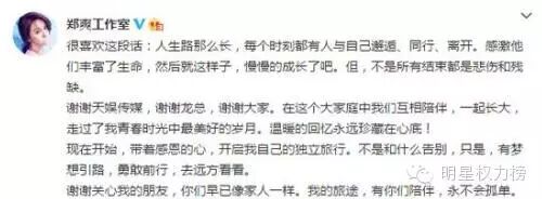表示郑爽将成立个人工作室,其后所有的演艺工作将由郑爽工作室独立完成。
