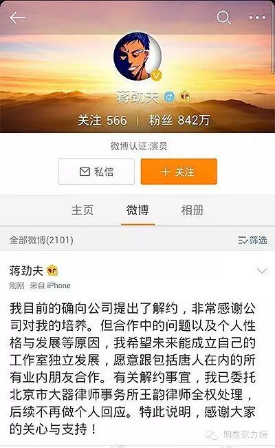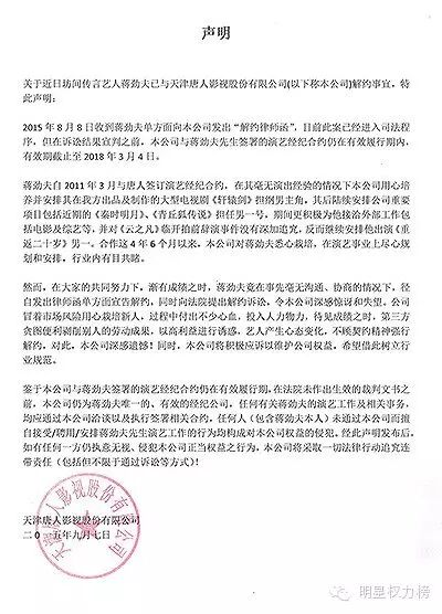 起因是唐人电影官微发布声明称:收到蒋劲夫单方面的“解约律师函”,并已进入司法程序。