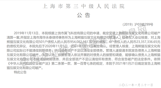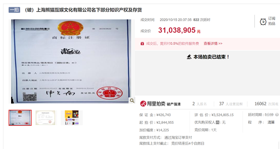 王思聪一公司破产拍卖,清库存卖了3100万 南方都市报 内地男星 2021-01-30 18:14:10 872 创作不易,用心坚持,欢迎请BaGua喝几杯爱心咖啡!打赏并支持本文 打赏并删除本文 1月28日,上海破产法庭召开新闻发布会。南都记者获悉,王思聪旗下上海熊猫互娱文化有限公司(下称“熊猫互娱”)破产清算一案中,近9000件库存货品通过网拍以3100万元成交,溢价率高达991%。南都记者注意到,这场拍卖早在2020年10月15日就已完成,标的物为熊猫互娱名下的部分知识产权及剩余存货,分别为:222项注册商标及部分商标申请权、11件美术作品、6项类似摄制电影方法创作作品、11项软件着作权、19个域名、硬盘及源代码、9000余件存货商品,起拍价为284.5万。此外,南都记者从全国企业破产重整案件信息网获悉,经债权人会议核查,对熊猫互娱501户债权人的9.54亿元债权、4户债权人的2335.73万债权无异议,经管理人核实,截至2020年12月30日,熊猫互娱名下的破产财产共计7617.05万元。1月22日,上海市第三中级人民法院确认熊猫互娱已不能清偿到期债务,并且全部资产不足以清偿所以债务,裁定熊猫互娱破产。对于7000余万的破产财产分配,扣除诉讼费和破产费用外,可供分配的总额约为6082.24万元。据南都记者了解,在约9.77亿元的债权中,包括职工债权和社保债权约63.47万元,熊猫互娱对于这一部分债权的清偿率为100%,不过高达9.76亿的普通债权的清偿率仅6.23%。其中,腾讯云1.1亿的债权只能拿回686.86万元。上海久诚律师事务所合伙人许峰律师告诉南都记者,如果确定熊猫互娱的所有财产只有那么多,就按照破产程序走完即可,“熊猫互娱为有限公司,只要股东依法履行了出资义务,则不需要承担公司债务”。资料显示,王思聪2015年成立熊猫直播,顶着中国首富之子光环,两年间熊猫直播经历6轮融资,A轮融资6.5亿,b轮融资达到10亿,估值达到50亿。2017年5月以后熊猫TV再无融资进账,2018年熊猫TV陷入资金危机,欠宽带费、欠主播薪资,2019年3月30日,在运行了1286天后,熊猫TV关闭服务器。此后,由于与熊猫互娱投资人的纠纷,王思聪被法院多次列为被执行人,直至2019年12月底才陆续取消限制消费令。2019年12月26日,普思资本公告显示,称在熊猫互娱创业中,普思投资实控人为熊猫互娱投资者提供了连带担保,导致公司债务牵涉到个人,经过近两月几十轮商谈,普思资本与数十位熊猫互娱投资人全部达成协议,所有投资人都将得到赔偿,熊猫互娱近20亿元巨额投资损失全部由普思投资及实控人自己承担。许峰律师表示,如果经过确权,连带属实,即使熊猫破产,王思聪要继续承担责任。不过,目前暂未披露投资人赔偿进展。南都记者注意到,熊猫互娱的500余位债权人里也包括王思聪的普思投资,且其是在2020年11月之后进行的补充申报,债权为1214.29万元。南方都市报(nddaily)报道南都记者 叶露* 南方都市报(nddaily)原创内容未经授权,不得转载。 ▊ 南都君特选(戳下方标题)胡歌起诉广东一贴身衣物企业与他人保持不正当性关系,他栽了 创作不易,用心坚持,欢迎请BaGua喝几杯爱心咖啡!打赏并支持本文 打赏并删除本文 感谢您的支持鼓励,我会继续努力的!文章地址:用户邮箱:打赏金额:USDT 请输入数字点击”去打赏“,即可进行打赏支持本文章哦 王思聪 About the Author 南方都市报 功能介绍:南都,换一种方式 官方认证:南方都市报社 Related Posts 李亚鹏回应 2022-07-15 17:59:25 刘畊宏一周涨粉2500万,背后经纪公司揭秘 2022-04-24 00:09:21 张信哲被举报,回应了 2021-12-31 00:05:44 著名主持人周涛,履任新职 2021-12-25 00:15:25 这电影成爆款!吴京/易烊千玺/朱亚文……还原一场悲壮战役 2021-10-01 17:21:27 发表评论