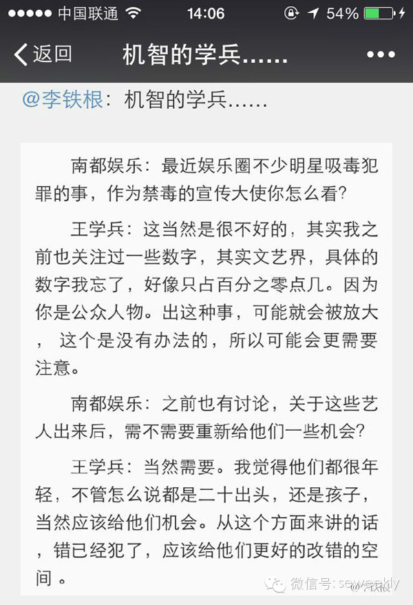 禁毒义务宣传员王学兵吸毒被抓的消息被爆出来后,此前他接受本刊采访时说的一段话也被疯传,围观群众纷纷表示:真是机智!