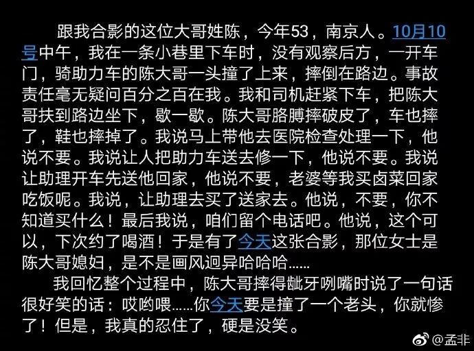 10月18日,孟非发送了一条微博,讲述他10月10日下午因为下车开门没有注意观察后方,将一名骑电动车的大哥碰倒的事故。