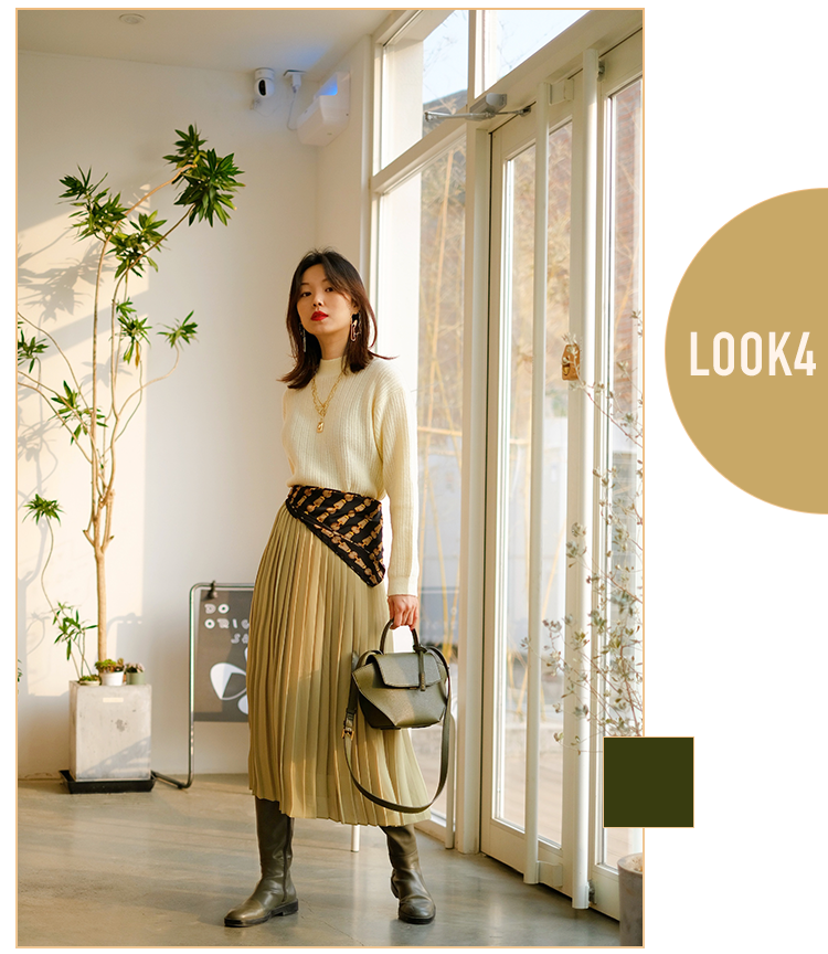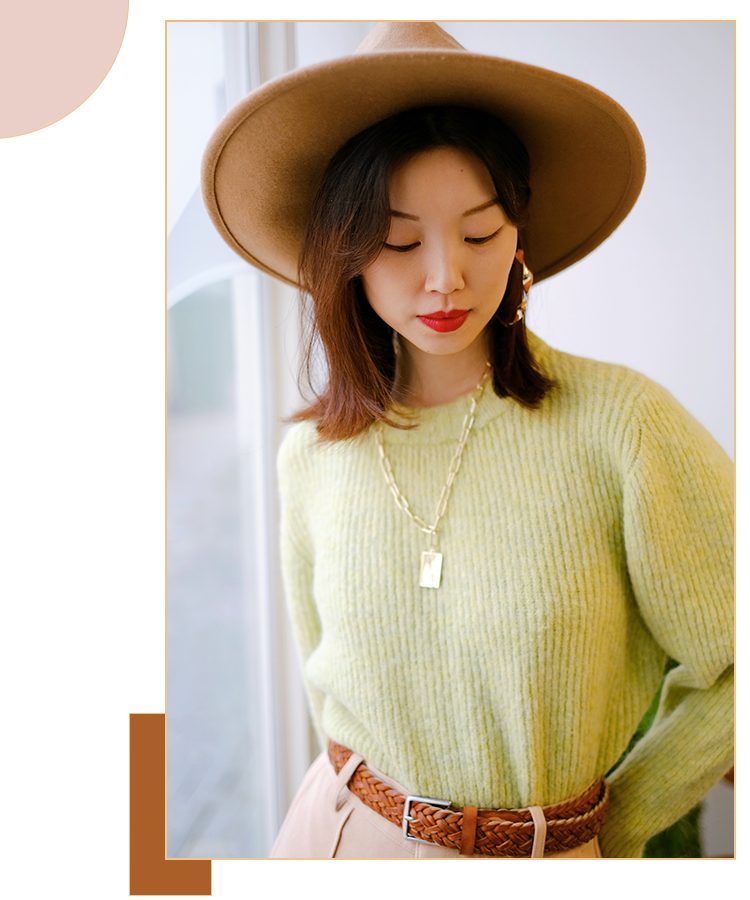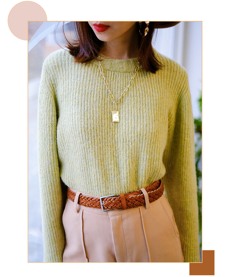 因为版型属于基本款,那么在色彩上我就可以放心地选择亮色系。苹果绿是个特别神奇的颜色,在夏天穿很清凉爽朗,但它在冬天穿就会显得活力吸睛。尤其是苹果绿的毛衣,利用这种清爽的颜色令身体看上去轻盈无比,上身效果非常显瘦。