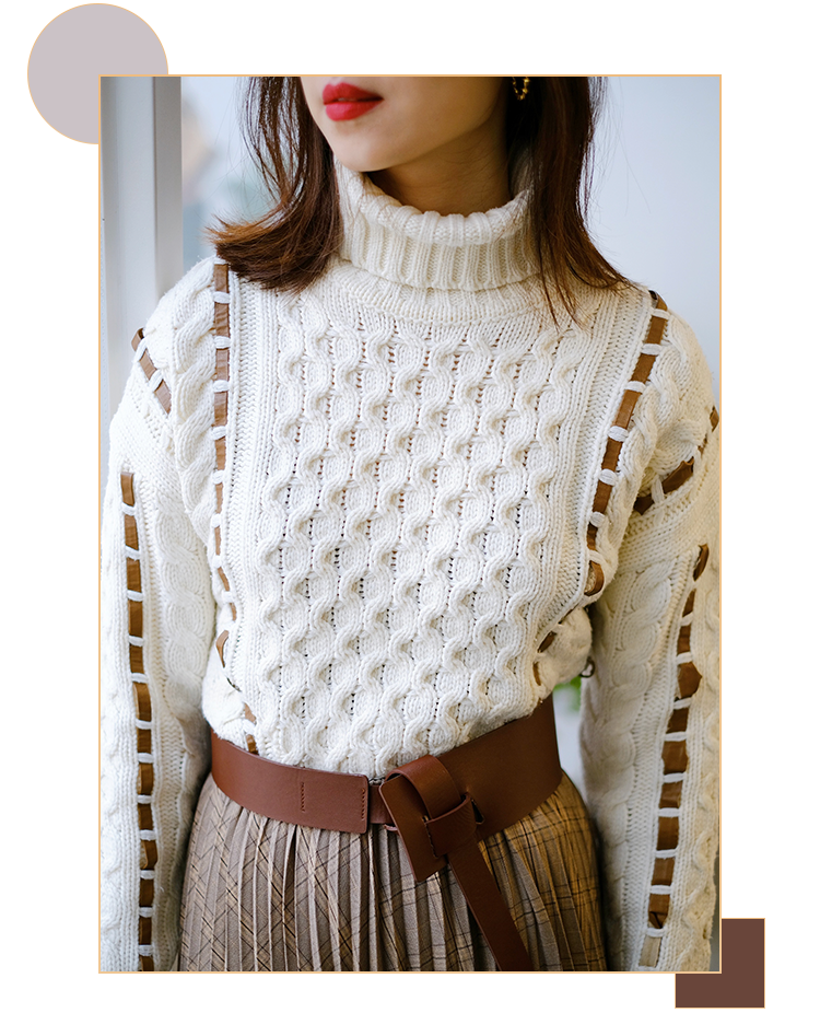 这款毛衣由于是中长款,所以还自配了腰带,搭配在毛衣外面露出腰线,调整好上下身的比例,轻轻松松就能穿出大长腿。