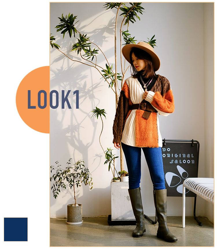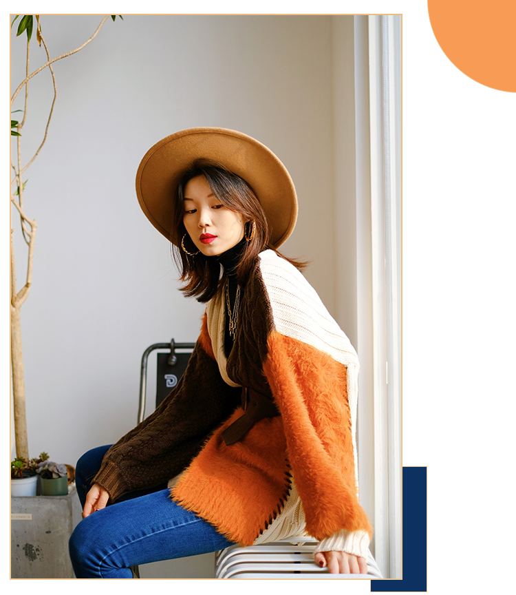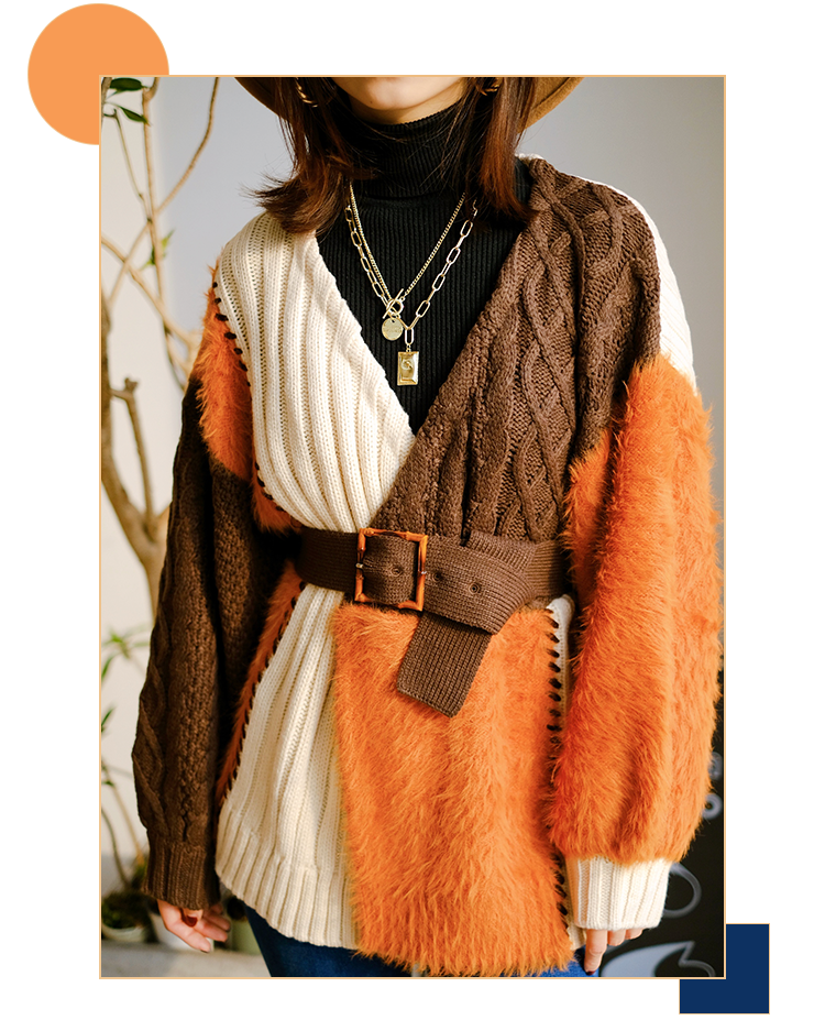 这款拼接毛衣在颜色上也非常考究,米白、亮橘色和深棕色的搭配很有冬季的暖意,单从视觉上就能感受到一丝温情。我还特别喜欢它的补丁元素,在毛料的衬托下有一种慵懒的野性美,增加了酷酷的牛仔气质,避免了过于甜美所带来的俗气。