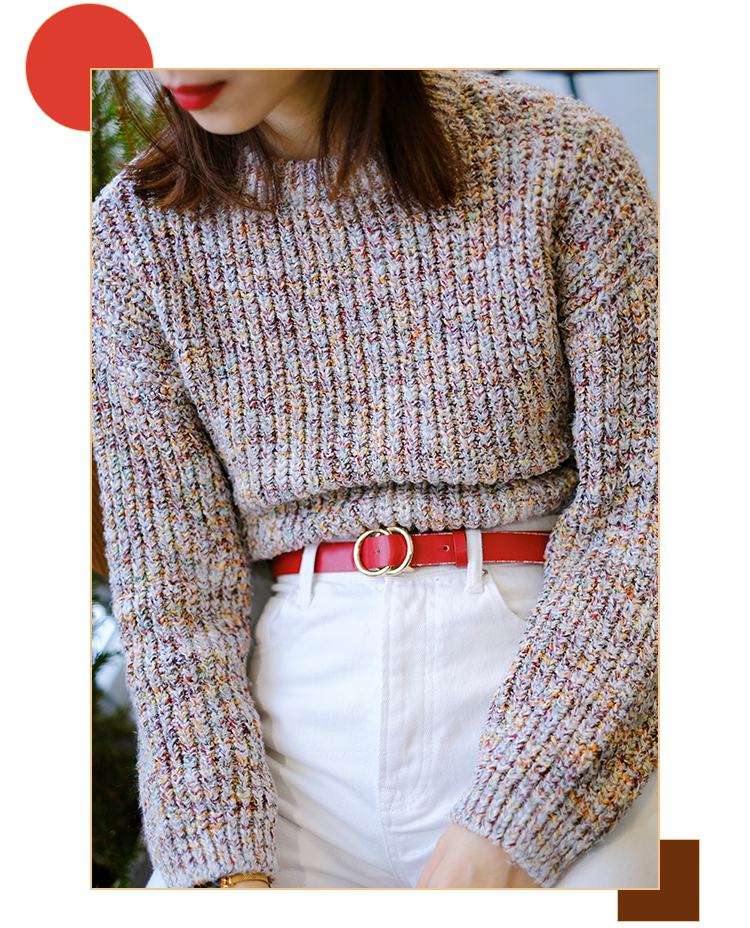 每到春节,大家都会想要尝试红色系,但又怕穿不好显老气。那么这款毛衣我就十分推荐,杂色毛衣里包含了红色系,一眼看上去很有节日的气氛,不像大面积红色穿起来那么难驾驭。