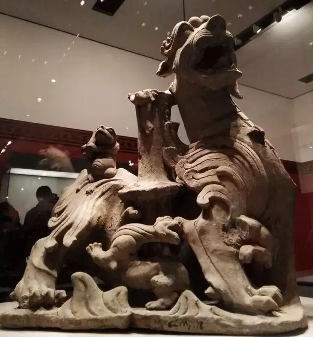 展厅中间有一个独立展柜总是围着不少人。“陶辟邪座”,其实是一株摇钱树的底座。辟邪是汉代流行的一种神兽,其形象融合了中外文化。专家说,随着汉代丝绸之路开通,狮子这类猛兽传入中国。辟邪的形象就很可能是以狮子为母体,杂糅了其他鸟兽的局部特征,把现实与幻想融为一体,创造出有角、利爪、肩生羽翼的神兽形象。展柜里的这只辟邪呈站立状,背部驮有摇钱树的中空矮柱,臀部蹲坐一只蟾蜍,右前腿边上有2只小兽。