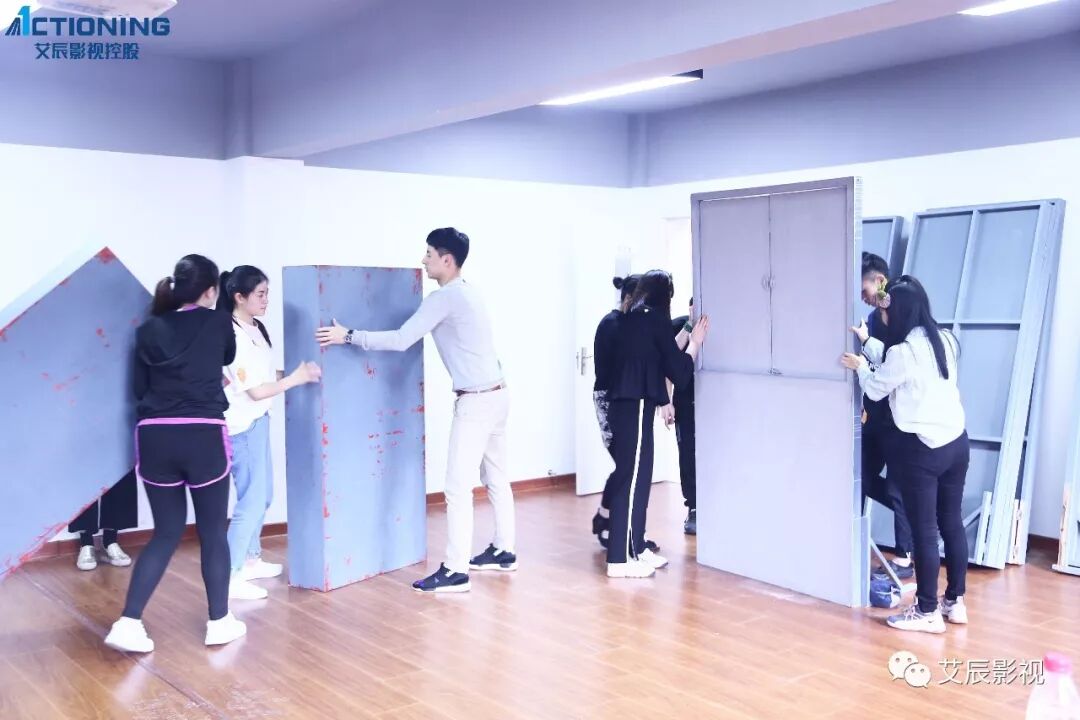 和学员们一起搬道具,布置表演现场。