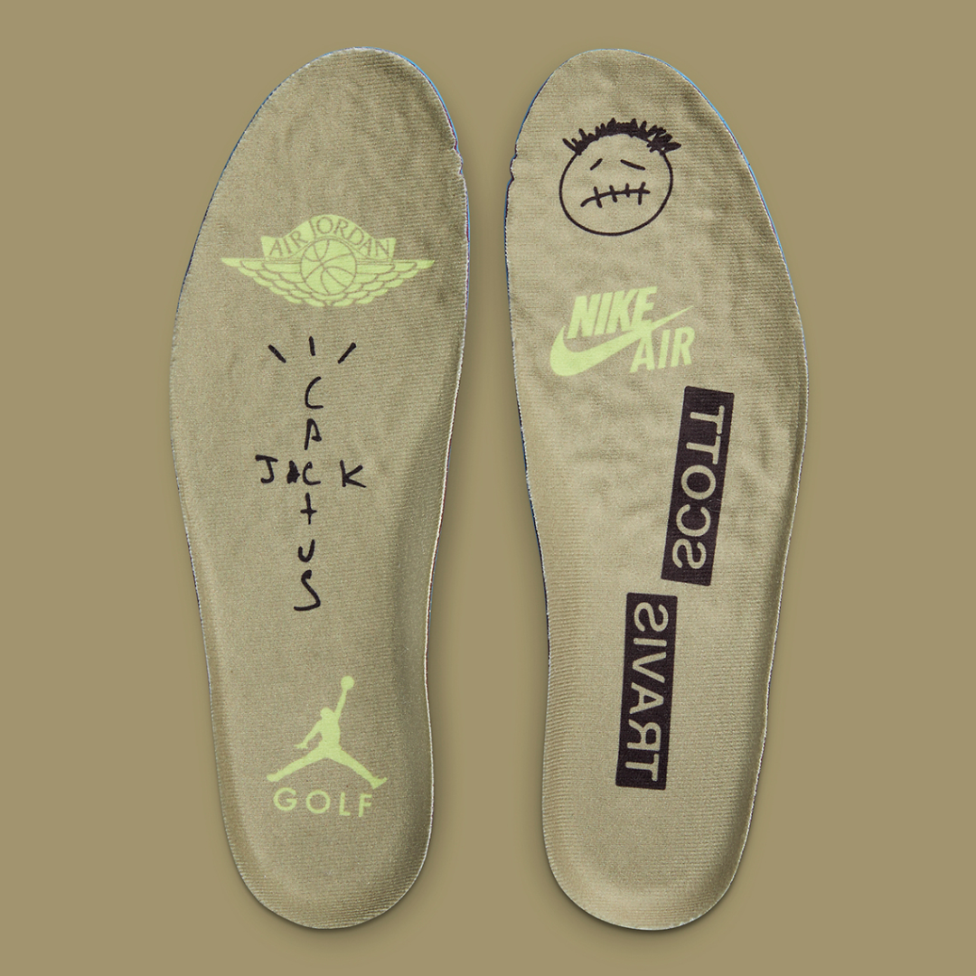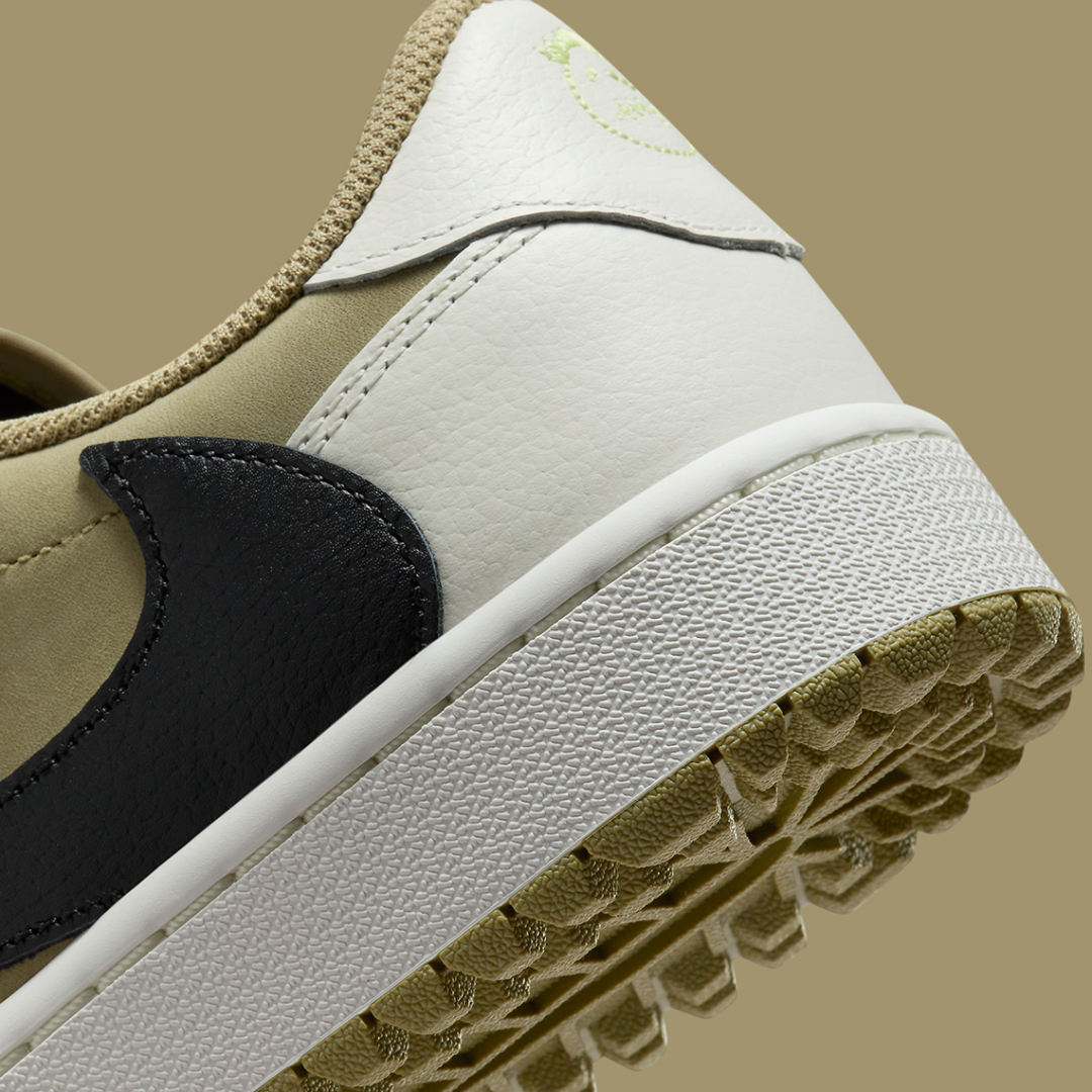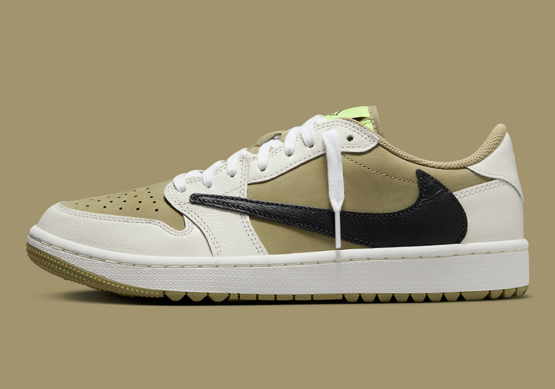 最近Travis Scott x Air Jordan 1 Low OG Golf “Olive” 的官方大图终于释出了,虽然是高尔夫款,但这款除了高尔夫的鞋底之外整体外观和之前的AJ1并没有太大差别。