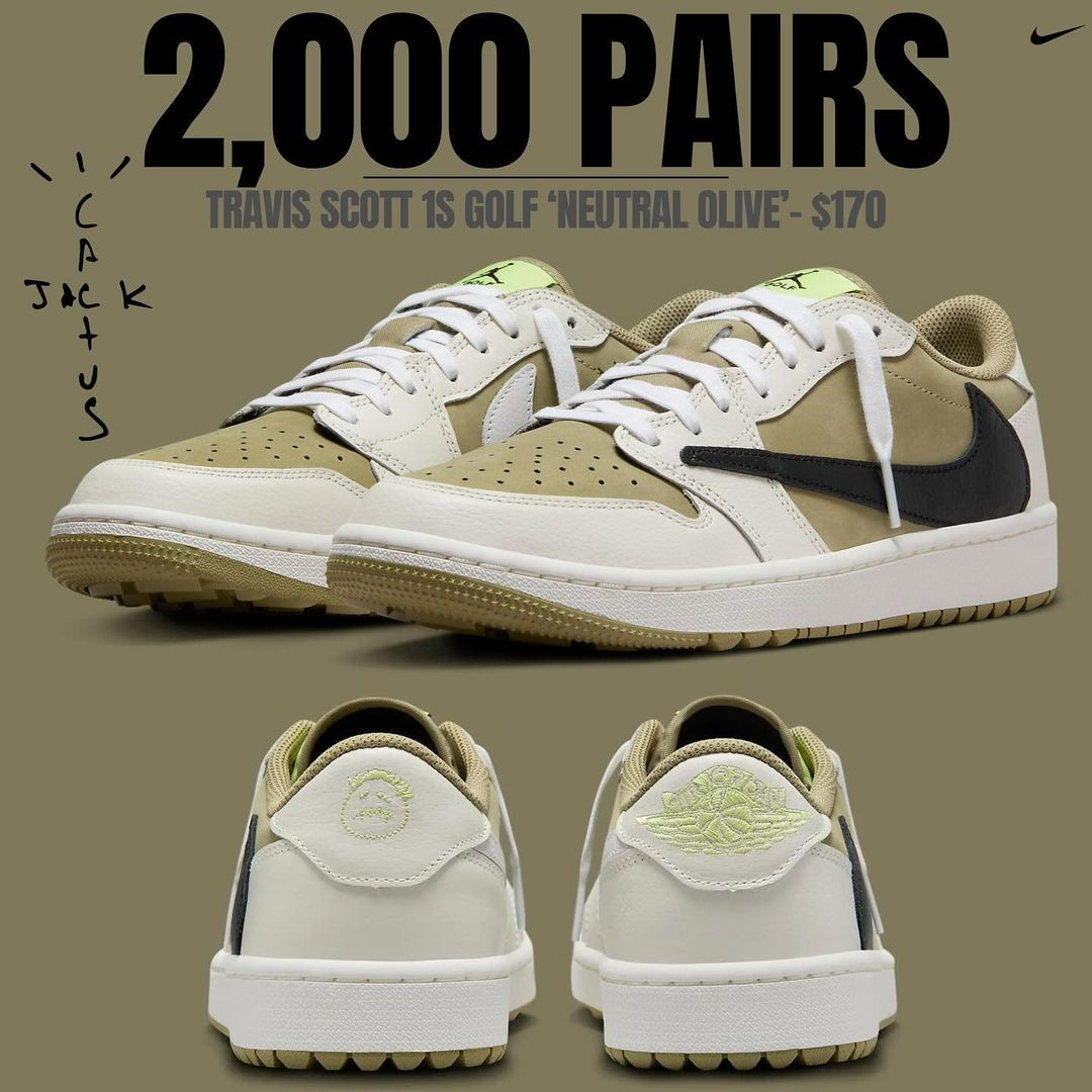 整体的橄榄绿色调非常有Travis Scott个人的风格,所以相信即便如此相信最后还是会有不少鞋友试着争抢这双经典的倒钩款式,但是,这双鞋的货量可能会非常不友好。