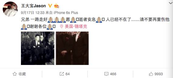 乔任梁去世,王大宝还发了一条微博,希望大家尊重逝者,不要重伤他。