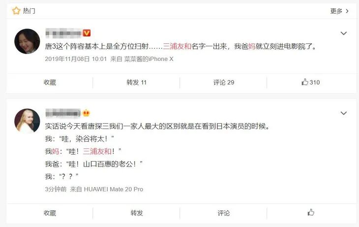 感谢《唐人街探案3》,让无数子女领略了爸妈们追星的业务能力。幕后功臣当然是三浦友和,凭借一己之力让平时嫌吵嫌票贵的爸妈,主动要求走进影院。