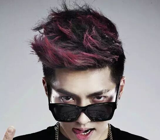 头顶的酒红色渐染以火焰的造型杂乱的竖立着,霸气无比,发根及两侧的黑发让整体更具酷感。