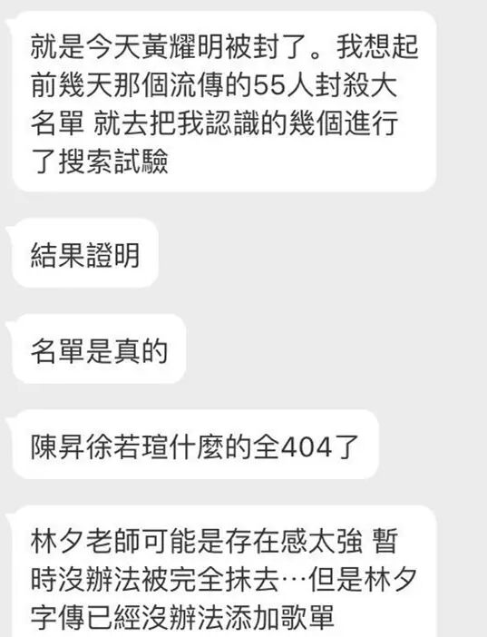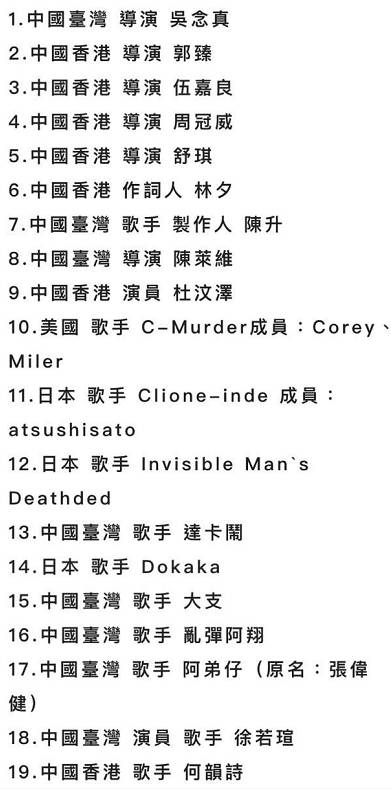 12月30日,在台湾网站上发布了一篇文章,声称根据《苹果日报》的报道,大陆文化部发布了55位全球艺人的封杀名单,除去之前提到的黄耀明、陈升、徐若瑄,舒淇、林夕、大支、何韵诗等人也通通在榜。