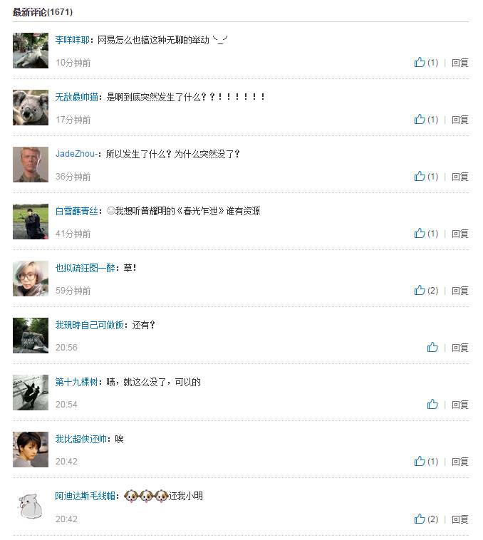 不仅如此,黄耀明也遭遇了同样的厄运。在网易云达明一派的评论下,掀起了一阵“求黄耀明”的潮流。突如其来的下架让网友震惊之余,越来越多的愤怒开始传染开来。