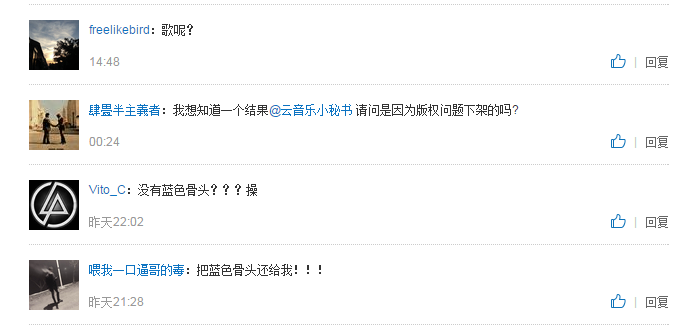 虽然有网友对于崔健专辑下架的问题提出反馈,却迟迟没有没能回复。