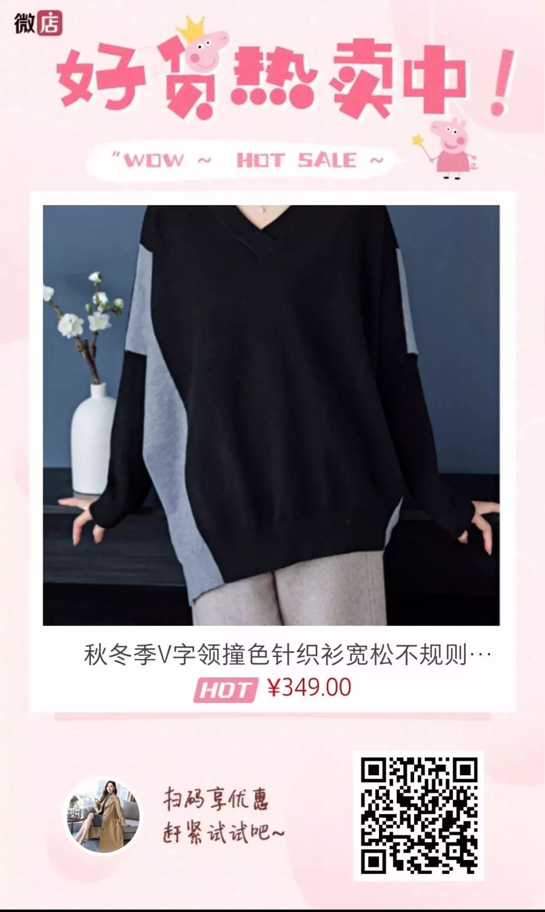 黑色在视觉上也有收缩的效果,黑色的宽松毛衣上身的效果更好。