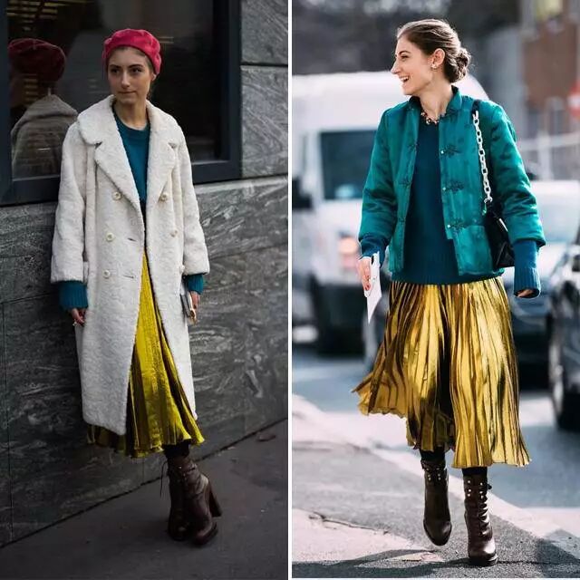 迷笛裙的长度是很适合的,冬天可以选一条迷笛百褶裙,搭配长大衣和短外套都很美。