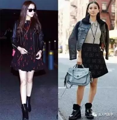同样是短裙、短靴,迪丽热巴身穿印花连衣短裙、皮外套,baby是黑白相间的衬衫、印花短裙、短款皮衣